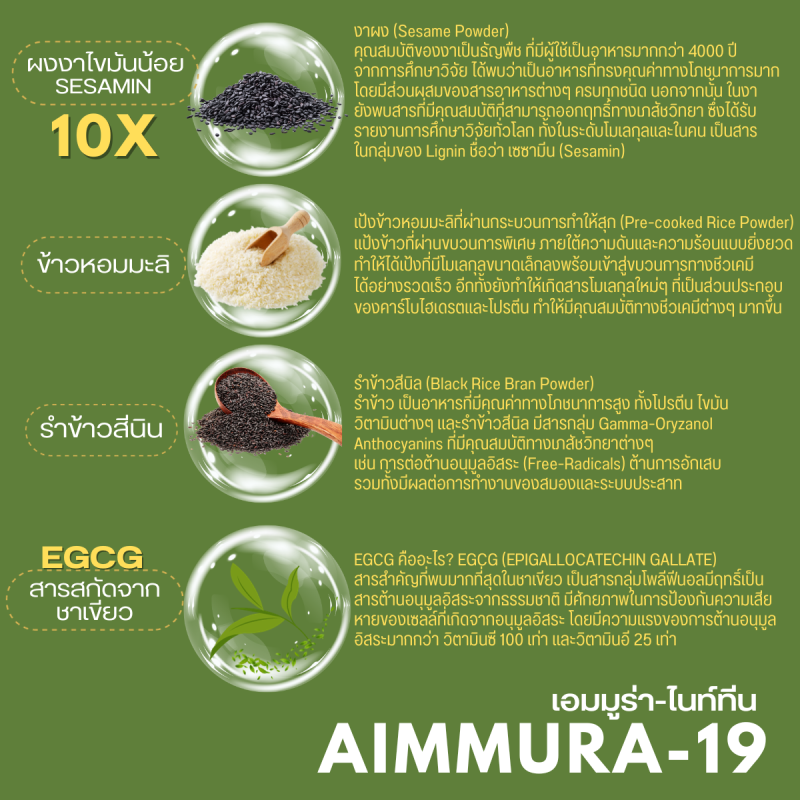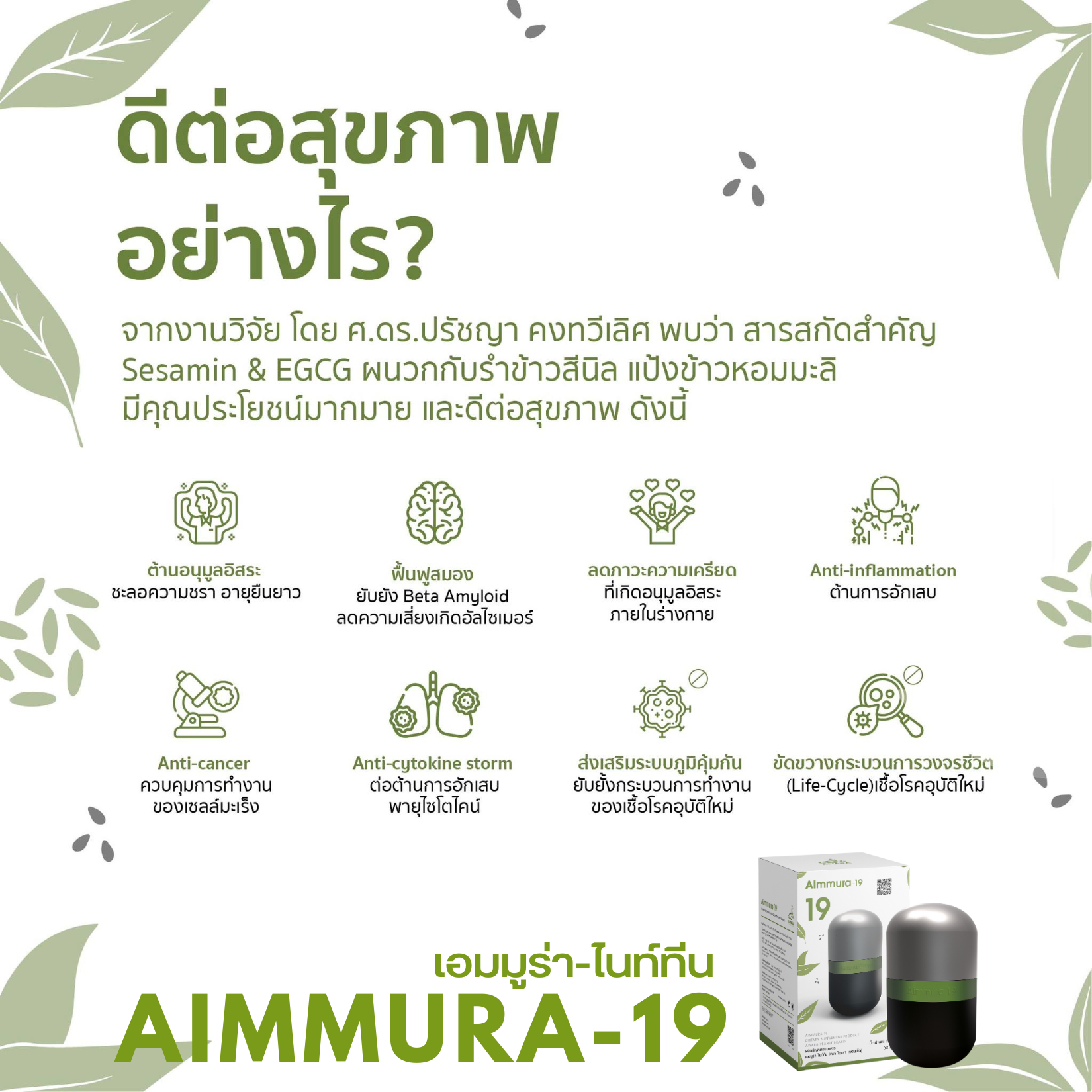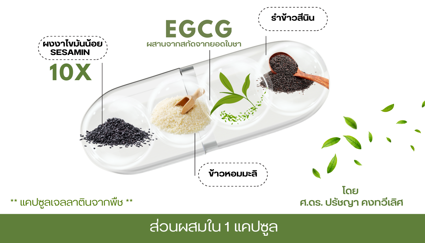 จากงานวิจัยโดย ศ.ดร.ปรัชญา คงทวีเลิศ พบว่าสารสกัดสำคัญ Sesamin & EGCG ผนวกกำลังกับรำข้าวสีนิลและ แป้งข้าวหอมมะลิ มีคุณประโยชน์มากมาย และดีต่อสุขภาพ ดังนี้Sesamin & EGCG ช่วยต้านอนุมูลอิสระ ชะลอความชรา ช่วยอายุยืนยาวSesamin & EGCG ฟื้นฟูสมอง ยั้บยั้ง Beta Amyloid ลดความเสี่ยงเกิดอัลไซเมอร์Sesamin & EGCG ลดภาวะความเครียด ที่เกิดจากอนุมูลอิสระภายในร่างกายSesamin & EGCG ช่วย Anti-imflamation ช่วยต้านการอักเสบSesamin & EGCG ควบคุมการทำงานของเซลล์มะเร็งSesamin & EGCG ต่อต้านการอักเสบ พายุไซโตไคน์Sesamin & EGCG ยั้บยั้งการทำงานของเชื้อโรคอุบัติใหม่ Sesamin & EGCG ขัดขวางขบวนการ วงจรชีวิต (Life-circle) เชื้อโรคอุบัติใหม่
